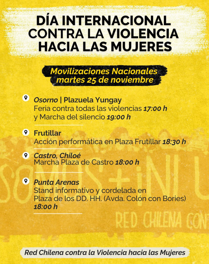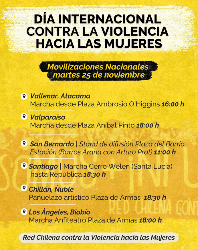En este nuevo día internacional de la no violencia contra la mujer, que se conmemora por el asesinato de las hermanas Patria, Minerva y María Teresa Mirabal en 1960, en República Dominicana bajo la Dictadura de Leonidas Trujillo, y se estableció en 1981 para denunciar la violencia contra las mujeres y niñas a nivel mundial y exigir su erradicación- las invitamos a adherir a las marchas que se realizarán en diferentes regiones del país para conmemorar este día, convocadas por la Red Chilena contra la Violencia hacia las Mujeres.